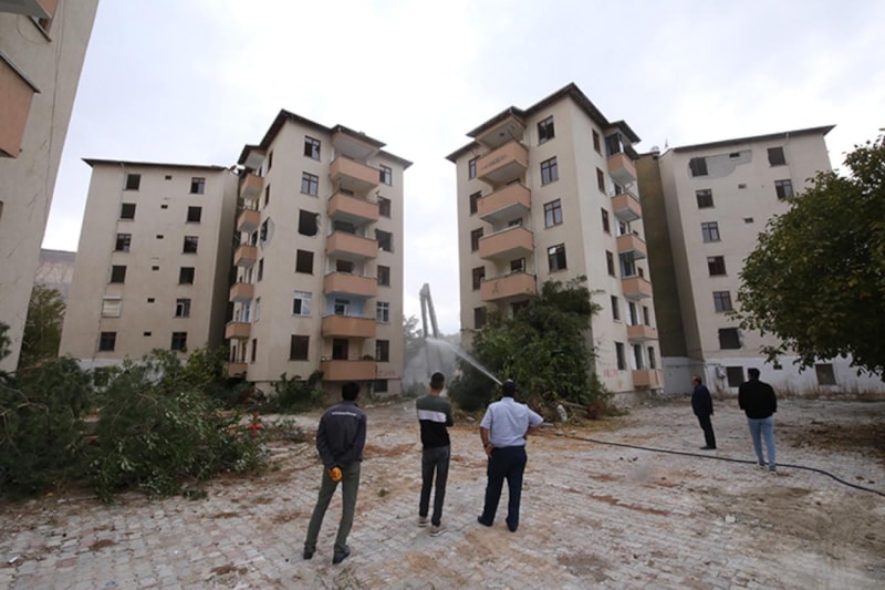Güvenlik tedbirleri alan ekipler, iş makineleri yardımıyla Hacıderviş Mahallesi'ndeki Yıldız Sitesi'ndeki blokların yıkımına başladı.