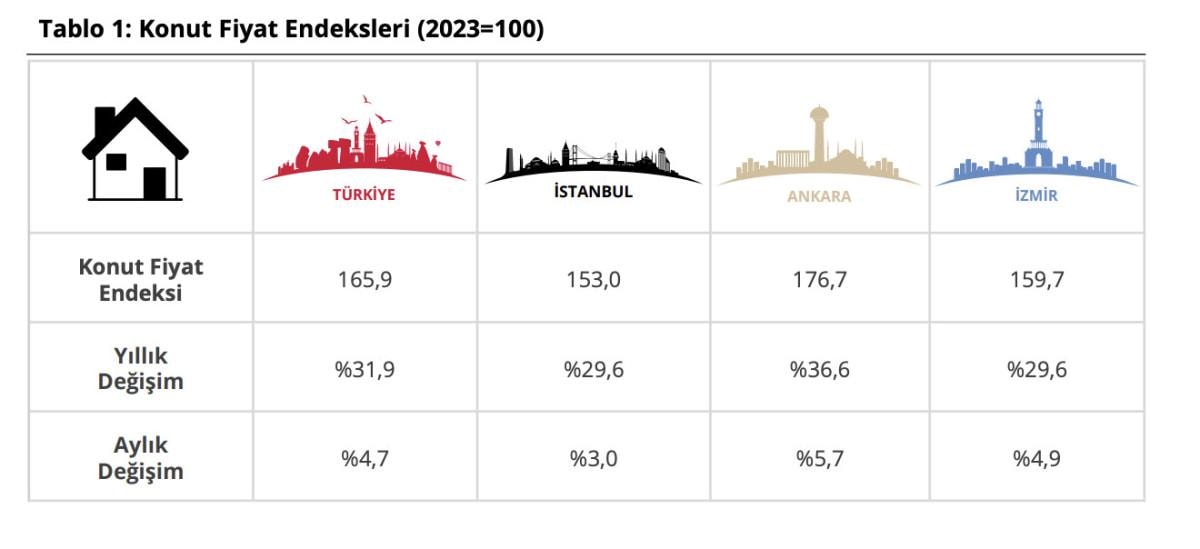 İstanbul, Ankara ve İzmir’in konut fiyat endekslerindeki gelişmeler değerlendirildiğinde, 2025 yılı Ocak ayında bir önceki aya göre, sırasıyla yüzde 3, 5,7 ve 4,9 oranlarında artış gözlendi.