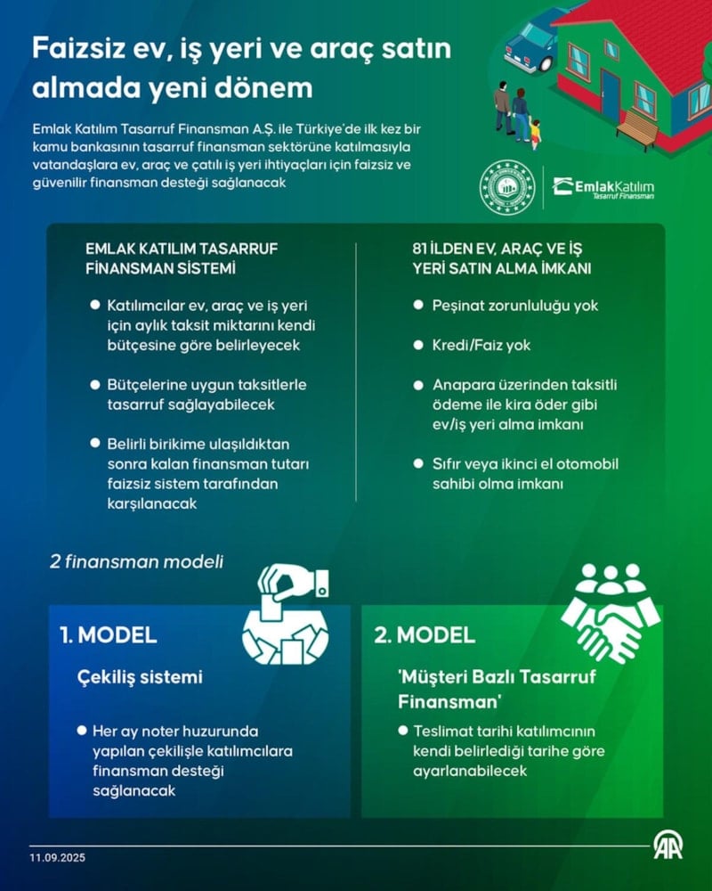 81 ilde faizsiz ev, iş yeri ve araç satın almayı sağlayacak Tasarruf Finansman Sistemi'ne dair 10 soruya, işleyişten başvuruya, katılım şartlarından taksit imkanına kadar kapsamlı yanıtlar verildi.