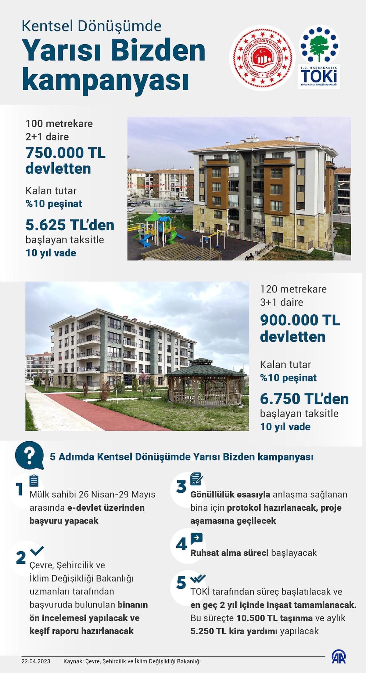 Bakan Kurum Kentsel Dönüşümde "Yarısı Bizden" kampanyası kapsamında yapılacak konutların en geç 2 yıl içinde teslim edileceğini, hak sahiplerine 10 bin 500 lira taşınma, 5 bin 250 lira kira yardımı yapılacağını söyledi.