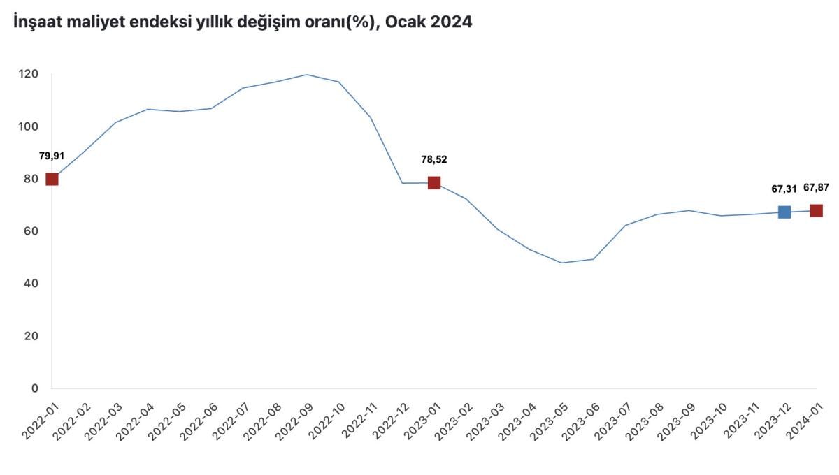 İnşaat maliyet endeksi 2024 yılı Ocak ayında, bir önceki aya göre yüzde 15,70 arttı, bir önceki yılın aynı ayına göre yüzde 67,87 arttı.