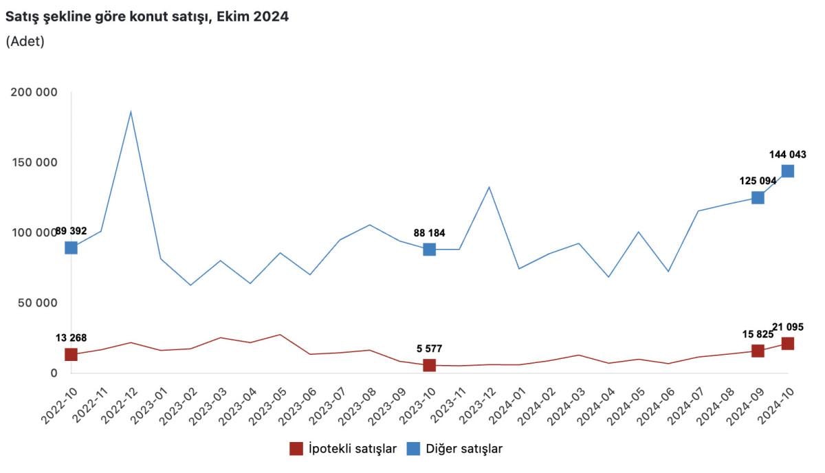 Türkiye genelinde diğer konut satışları ekim ayında, bir önceki yılın aynı ayına göre yüzde 63,3 oranında artarak 144 bin 43 oldu. Toplam konut satışları içinde diğer satışların payı yüzde 87,2 olarak gerçekleşti. Ocak-ekim döneminde gerçekleşen diğer konut satışları ise bir önceki yılın aynı dönemine göre yüzde 20,7 oranında artarak 998 bin 969 oldu.