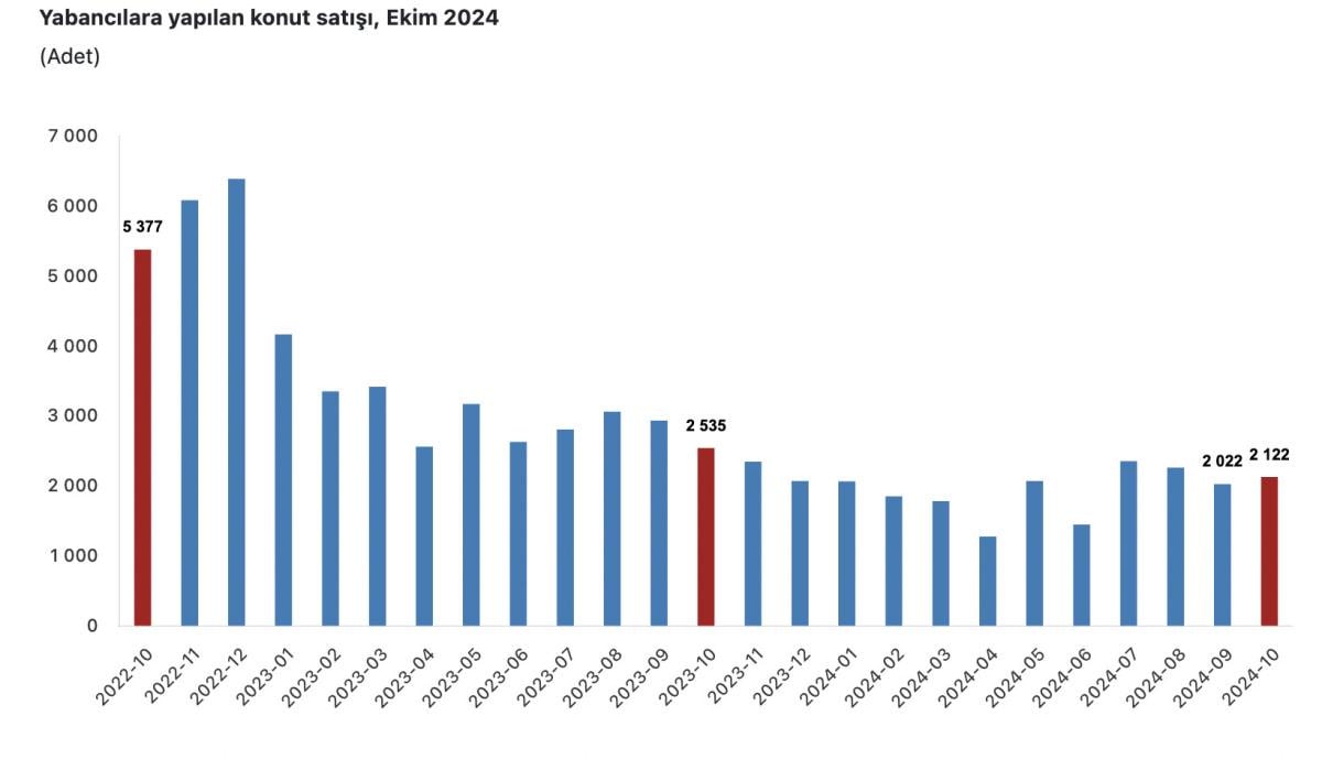 Yabancılara yapılan konut satışları ekim ayında bir önceki yılın aynı ayına göre yüzde 16,3 oranında azalarak 2 bin 122 oldu. Ekim ayında toplam konut satışları içinde yabancılara yapılan konut satışının payı yüzde 1,3 olarak gerçekleşti. Yabancılara yapılan konut satış sayısının en fazla olduğu iller sırasıyla 750 ile Antalya, 724 ile İstanbul ve 148 ile Mersin oldu.