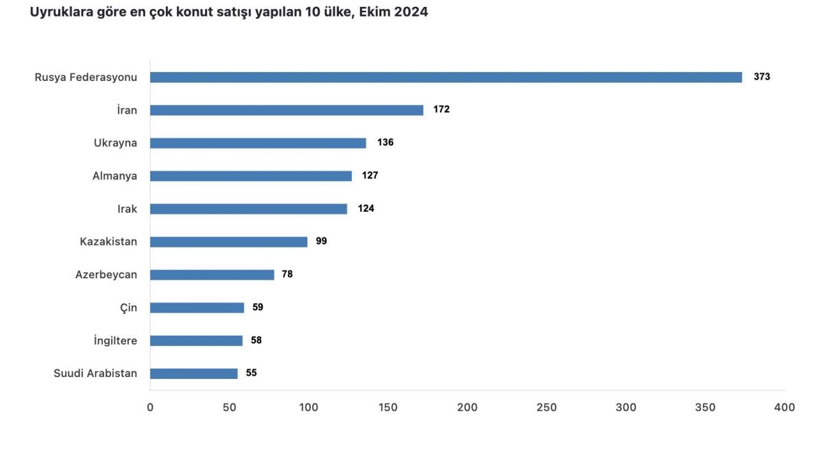 Ekim ayında ülke uyruklarına göre en fazla konut satışı sırasıyla 373 ile Rusya Federasyonu, 172 ile İran ve 136 ile Ukrayna vatandaşlarına yapıldı.