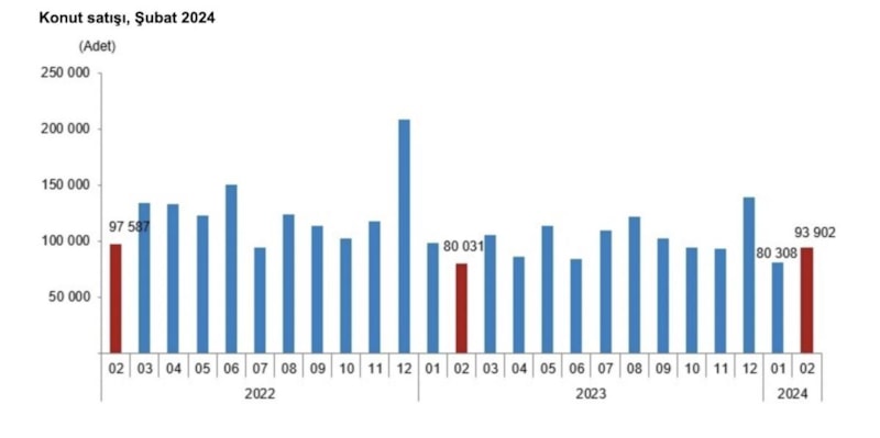 Türkiye genelinde konut satışları şubat ayında, bir önceki yılın aynı ayına göre yüzde 17,3 artarak 93 bin 902 oldu.
