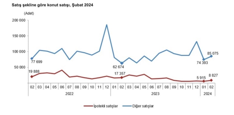 Türkiye genelinde diğer konut satışları şubat ayında, bir önceki yılın aynı ayına göre yüzde 35,7 artarak 85 bin 75 oldu. Toplam konut satışları içinde diğer satışların payı yüzde 90,6 olarak gerçekleşti. Ocak-şubat döneminde gerçekleşen diğer konut satışları ise bir önceki yılın aynı dönemine göre yüzde 10,6 artışla 159 bin 468 oldu.