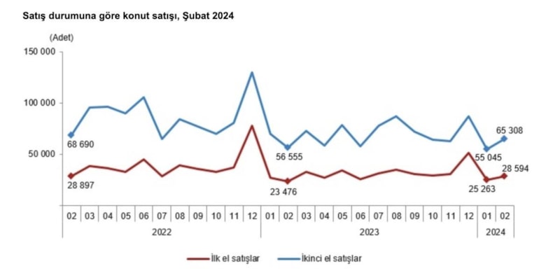 Türkiye genelinde ikinci el konut satışları şubat ayında, bir önceki yılın aynı ayına göre yüzde 15,5 artış göstererek 65 bin 308 oldu. Toplam konut satışları içinde ikinci el konut satışının payı yüzde 69,5 oldu. İkinci el konut satışları ocak-şubat döneminde ise bir önceki yılın aynı dönemine göre yüzde 5 azalışla 120 bin 353 olarak gerçekleşti.