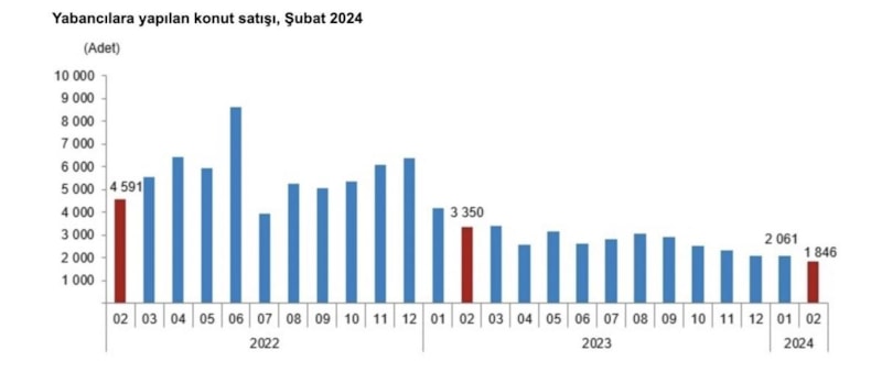 Yabancılara yapılan konut satışları şubat ayında, bir önceki yılın aynı ayına göre yüzde 44,9 azalarak 1.846 oldu. Şubat ayında toplam konut satışları içinde yabancılara yapılan konut satışının payı yüzde 2 oldu. Yabancılara yapılan konut satışlarında ilk sırayı 691 konut satışı ile İstanbul aldı. İstanbul'u sırasıyla 659 konut satışı ile Antalya ve 151 konut satışı ile Mersin izledi.