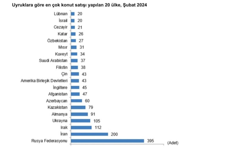 Şubat ayında Rusya Federasyonu vatandaşları Türkiye'den 395 konut satın aldı. Rusya Federasyonu vatandaşlarını sırasıyla 200 konut ile İran, 112 konut ile Irak ve 105 konut ile Ukrayna vatandaşları izledi.