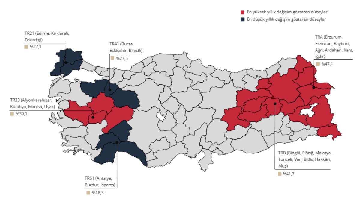 2025 yılı Şubat ayında bir önceki aya göre yüzde 2,8 oranında artan KFE, bir önceki yılın aynı ayına göre nominal olarak yüzde 31,3 oranında arttı, reel olarak ise yüzde 5,6 oranında azaldı.