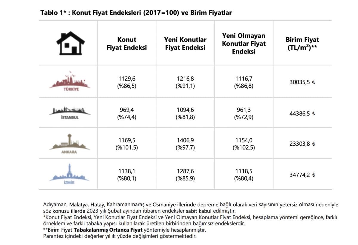 Metrekare başına birim fiyatları Türkiye geneli için 30 bin 35,5 TL, İstanbul’da 44 bin 386,5 lira ve Ankara’da 23 bin 303,8 lira ve İzmir için 34 bin 774,2 lira oldu.