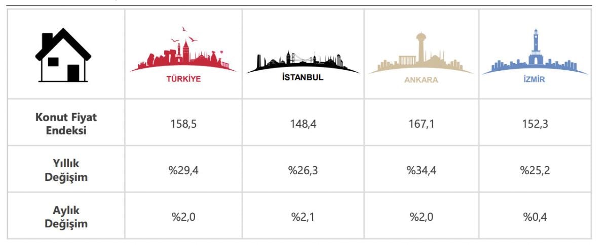 Türkiye’deki konutların kalite etkisinden arındırılmış fiyat değişimlerini izlemek amacıyla hesaplanan Konut Fiyat Endeksi, 2024 yılı Aralık ayında bir önceki aya göre yüzde 2 oranında artarak 158,5 seviyesinde gerçekleşti.
