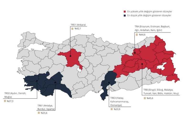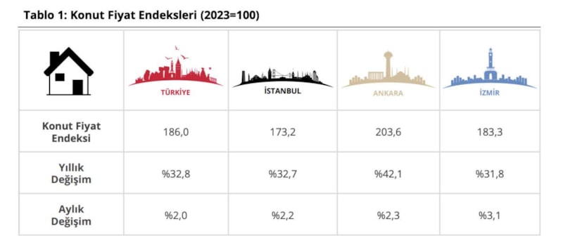 Endeks değerleri bir önceki yılın aynı ayına göre, İstanbul, Ankara ve İzmir’de sırasıyla yüzde 32,7, 42,1 ve 31,8 oranlarında artış gösterdi.