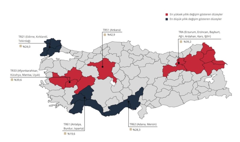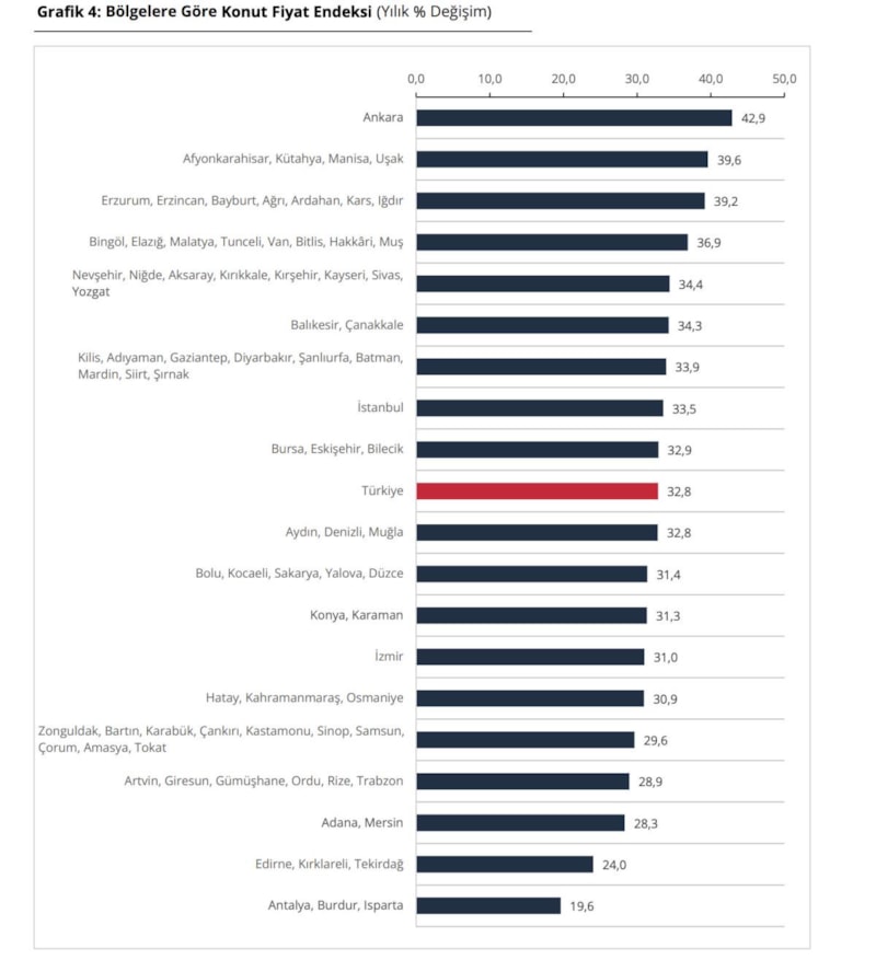 İstatistiki Bölge Birimleri Sınıflamasına göre bölgelerin yıllık konut fiyat endeksi değişimleri incelendiğinde, Temmuz 2025 döneminde en yüksek yıllık artış yüzde 42,9 ile Ankara bölgesinde, en düşük yıllık artış ise yüzde 19,6 ile Antalya Burdur, Isparta bölgesinde gözlendi.