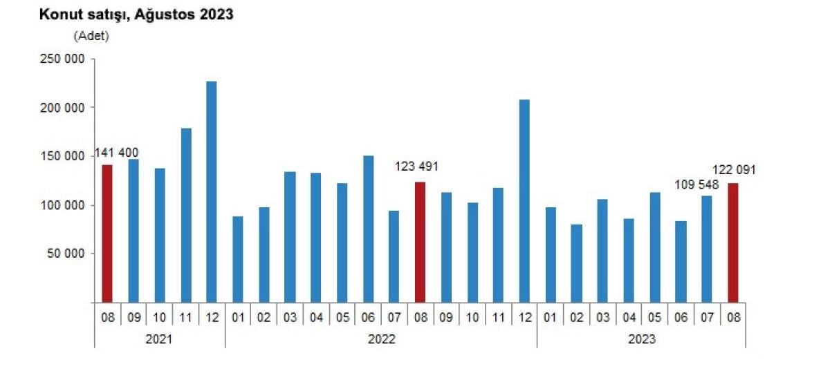 Türkiye genelinde konut satışları ağustos ayında bir önceki yılın aynı ayına göre yüzde 1,1 azalarak 122 bin 91 oldu.