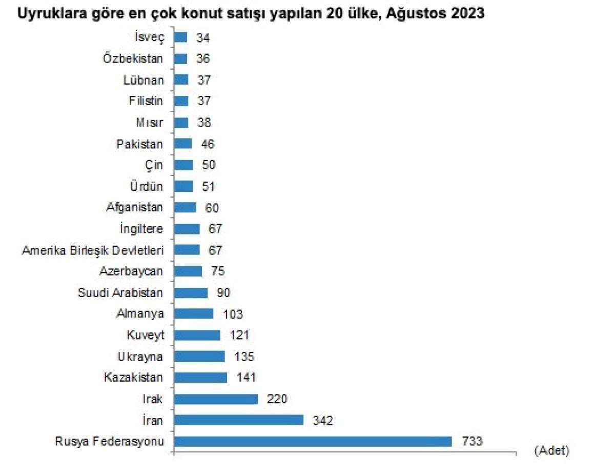 Ağustos ayında Rusya Federasyonu vatandaşları Türkiye'den 733 konut satın aldı. Rusya Federasyonu vatandaşlarını sırasıyla 342 konut ile İran, 220 konut ile Irak ve 141 konut ile Kazakistan vatandaşları izledi.