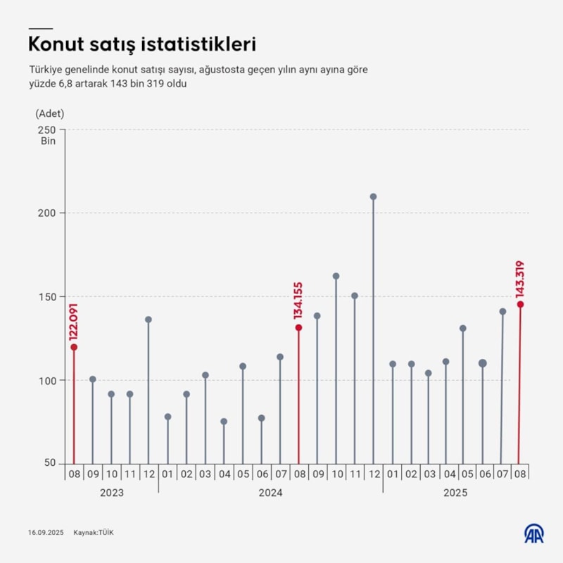 Ağustosta ülke genelinde konut satışları, yıllık bazda yüzde 6,8 artarak 143 bin 319 oldu.