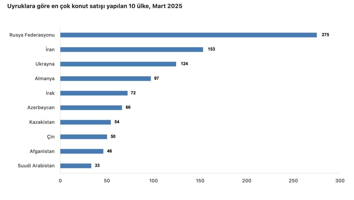 Mart ayında ülke uyruklarına göre en fazla konut satışı sırasıyla 275 ile Rusya Federasyonu, 153 ile İran ve 124 ile Ukrayna vatandaşlarına yapıldı.