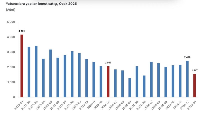 Yabancılara yapılan konut satışları ocak ayında, bir önceki yılın aynı ayına göre yüzde 24,9 oranında azalarak 1.547 oldu.