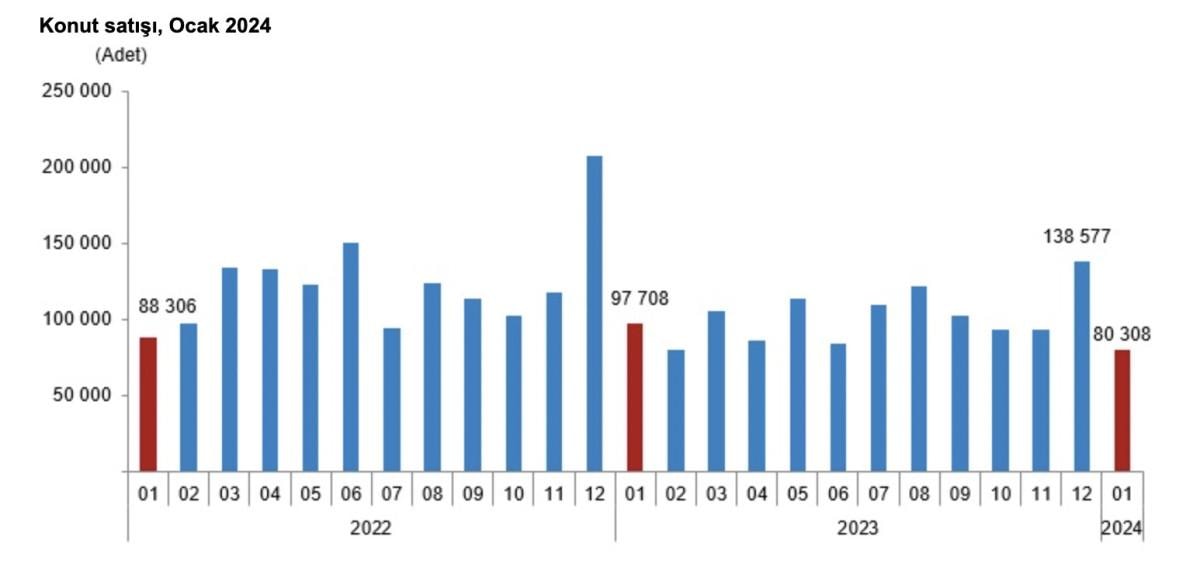 Türkiye genelinde konut satışları ocak ayında, bir önceki yılın aynı ayına göre yüzde 17,8 azalarak 80 bin 308 oldu.