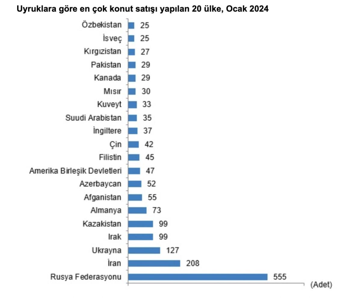 Ocak ayında Rusya Federasyonu vatandaşları Türkiye'den 555 konut satın aldı. Rusya Federasyonu vatandaşlarını sırasıyla 208 konut ile İran, 127 konut ile Ukrayna, 99 konut ile Irak ve Kazakistan vatandaşları izledi.