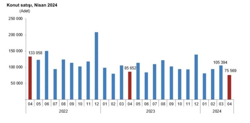 Türkiye genelinde konut satışları nisan ayında, bir önceki yılın aynı ayına göre yüzde 11,8 azalarak 75 bin 569 oldu.