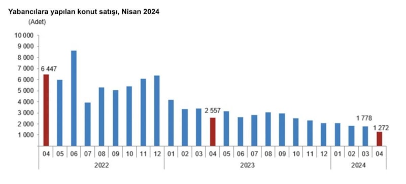 Yabancılara yapılan konut satışları ocak-nisan döneminde ise bir önceki yılın aynı dönemine göre yüzde 48,4 azalarak 6 bin 957 oldu.