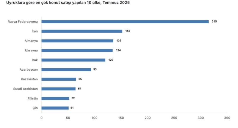 Temmuz ayında ülke uyruklarına göre en fazla konut satışı sırasıyla 315 ile Rusya Federasyonu, 152 ile İran ve 135 ile Almanya vatandaşlarına yapıldı.