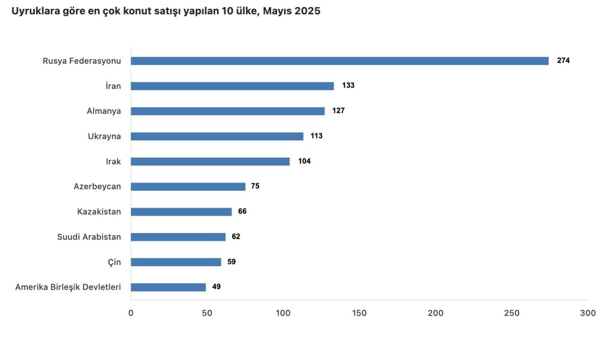 Türkiye İstatistik Kurumu (TÜİK) verilerine göre, Mayıs 2025'te yabancılara yapılan konut satışlarında ilk sırayı Rusya Federasyonu vatandaşları aldı.