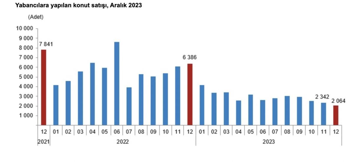 Yabancılara yapılan konut satışları 2023 yılı Aralık ayında, bir önceki yılın aynı ayına göre yüzde 67,7 azalarak 2 bin 64 oldu.