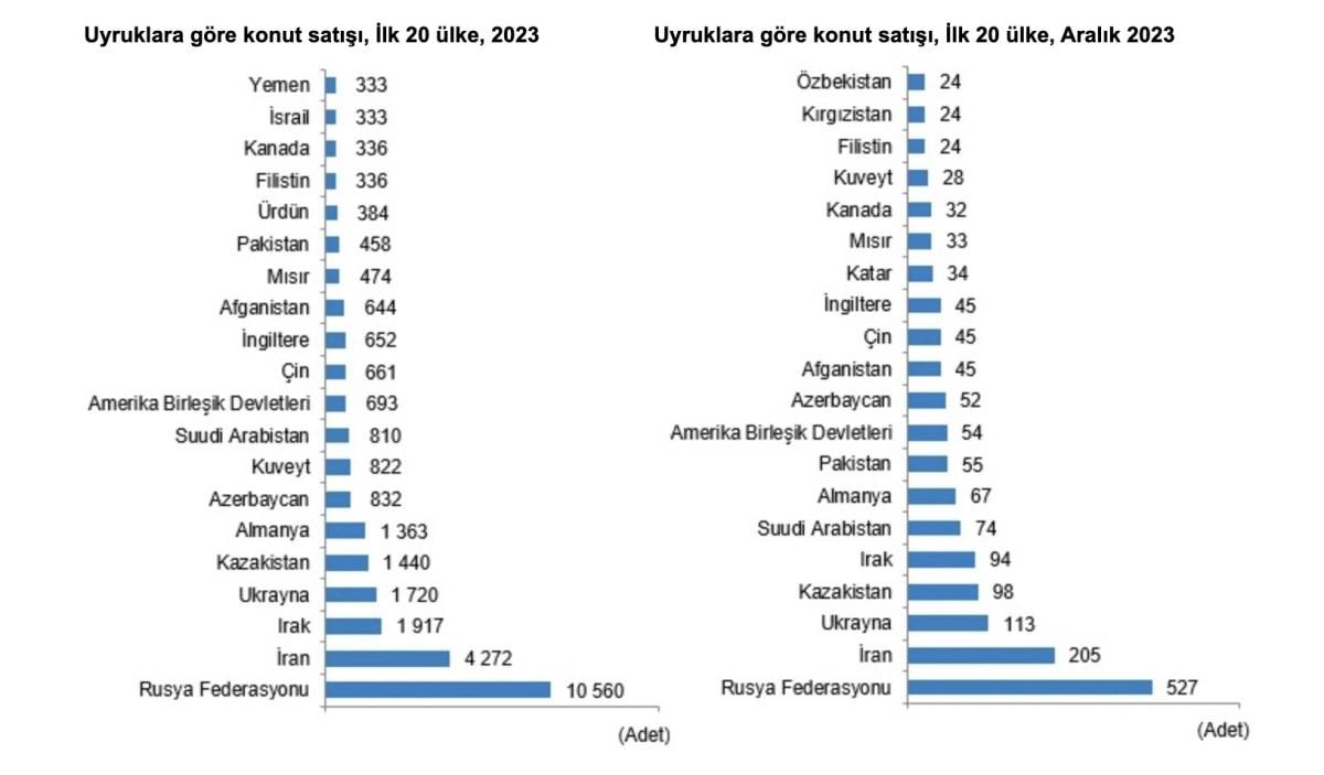 Rusya Federasyonu vatandaşları, 2023 yılında Türkiye'den 10 bin 560 konut satın aldı. Rusya Federasyonu vatandaşlarını sırasıyla 4 bin 272 konut ile İran vatandaşları ve 1.917 konut ile Irak vatandaşları izledi.