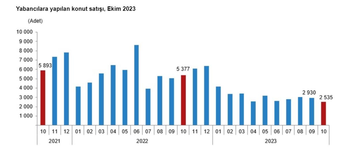 Yabancılara yapılan konut satışları ekim ayında, bir önceki yılın aynı ayına göre yüzde 52,9 azalarak 2 bin 535 oldu.