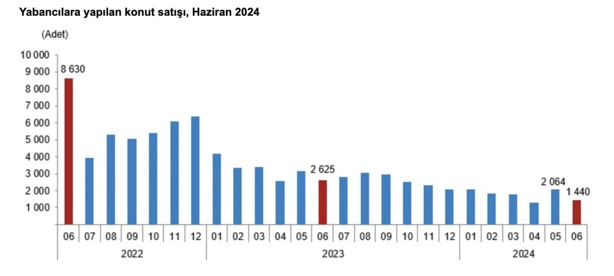 Yabancılara konut satışları haziran ayında ise 2023'ün aynı ayına göre yüzde 45,1 azalarak 1440 oldu.