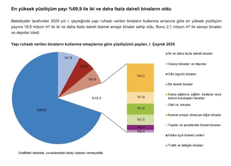 Kullanma amacına göre en yüksek pay 18,1 milyon metrekareyle iki ve daha fazla daireli ikamet amaçlı binaların oldu. Bunu 1,9 milyon metrekareyle sanayi binaları ve depolar takip etti.