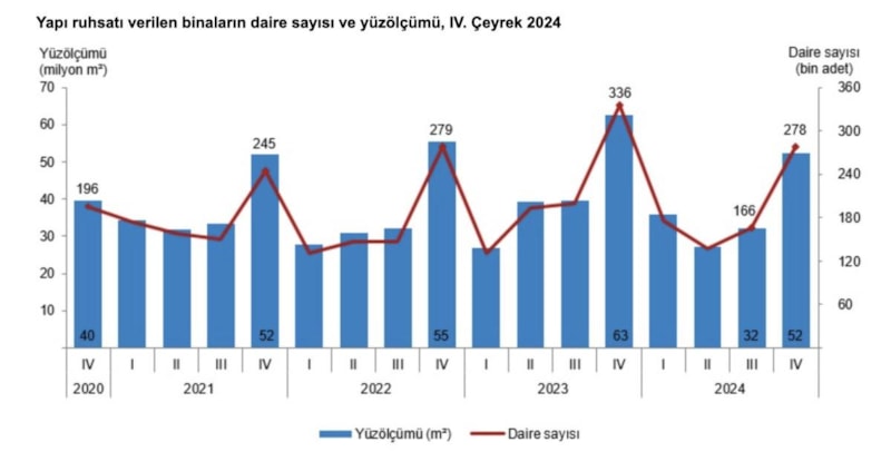 Belediyeler tarafından 2024 yılı son çeyreğinde yapı kullanma izin belgesi verilen binaların toplam yüz ölçümü 42,4 milyon metrekare iken; bunun 23,5 milyon metrekaresi konut, 9,6 milyon m²'si konut dışı ve 9,2 milyon metrekaresi ise ortak kullanım alanı olarak gerçekleşti.