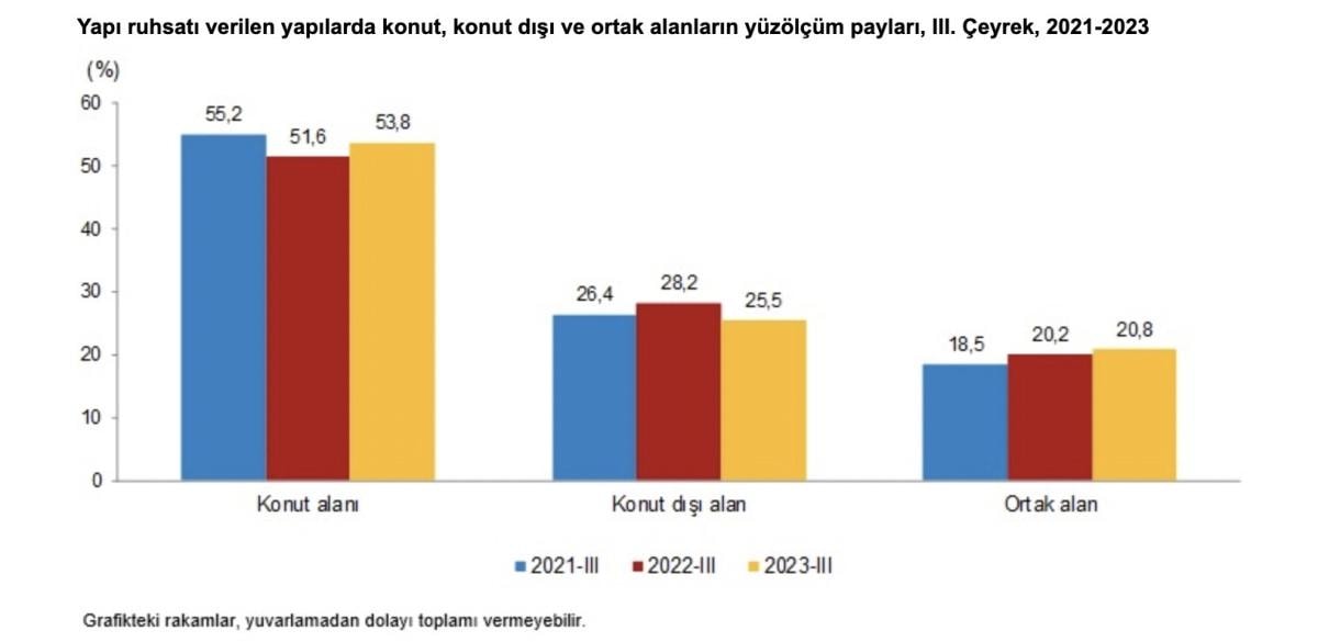 Belediyeler tarafından 2023 yılı üçüncü çeyreğinde yapı kullanma izin belgesi verilen yapıların toplam yüzölçümü 23,7 milyon metrekare iken; bunun 13,5 milyon metrekaresi konut, 5,1 milyon metrekaresi konut dışı ve 5,1 milyon metrekaresi ise ortak kullanım alanı olarak gerçekleşti. Toplam yüzölçümün yüzde 57'si konut alanı olarak gerçekleşti.