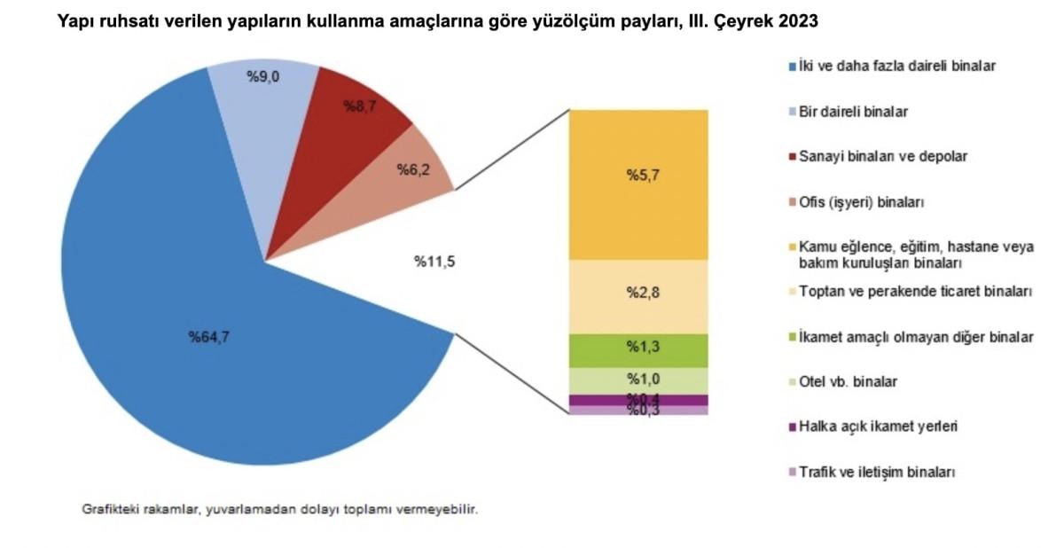 Belediyeler tarafından 2023 yılı III. çeyreğinde yapı ruhsatı verilen yapıların kullanma amacına göre en yüksek yüzölçüm payına 25,3 milyon metrekare ile iki ve daha fazla daireli ikamet amaçlı binalar sahip oldu. Bunu 3,5 milyon metrekare ile bir daireli binalar izledi.