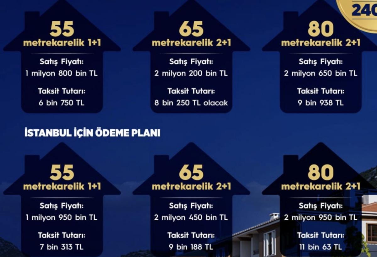 İstanbul’da 55 metrekarelik 1+1 konutların satış fiyatı 1 milyon 950 bin TL olarak belirlendi. Yüzde 10 peşinat (195 bin TL), 240 ay vade imkanı sunulacak. Bu konutların aylık taksiti 7 bin 313 TL olacak.