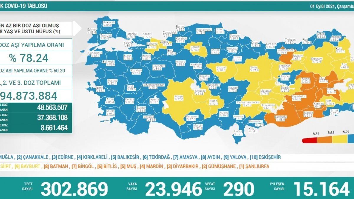 Buna göre; Türkiye'de son 24 saatte 302 bin 869 Kovid-19 testi yapıldı, 23 bin 946 kişinin testi pozitif çıktı, 290 kişi hayatını kaybetti.