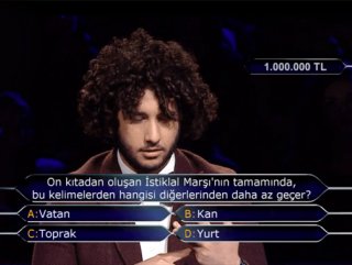 "On kıtadan oluşan İstiklal Marşı'nın tamamında, bu kelimelerden hangisi diğerlerinden daha az geçer?" sorusuna genç yarışmacı "Vatan, kan, toprak, yurt" seçenekleri arasından "toprak" cevabını verdi.