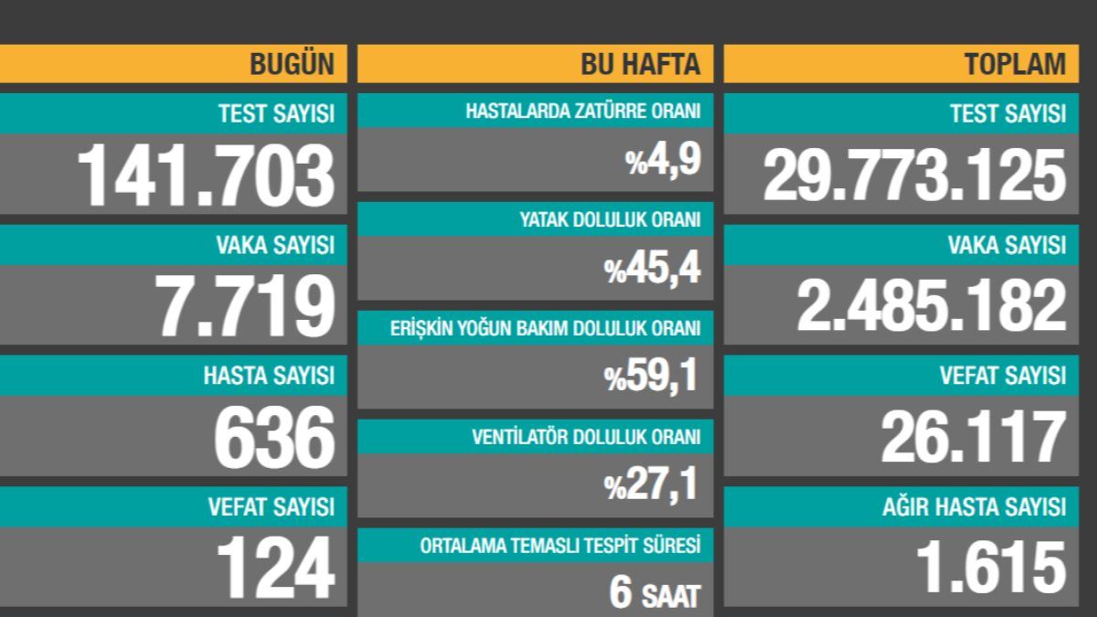 Bugünkü tabloya göre, son 24 saat içerisinde 141 bin 703 kişiye koronavirüs testi yapıldı.