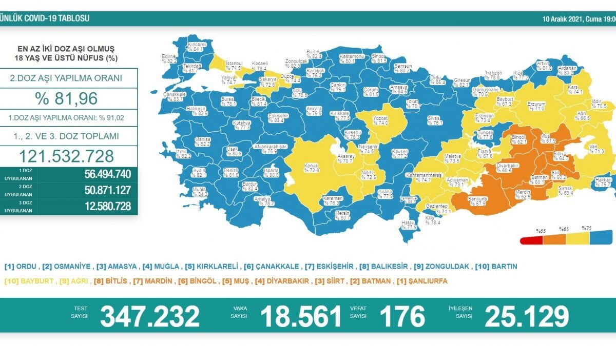 Buna göre; Türkiye'de son 24 saatte 347 bin 232 Kovid-19 testi yapıldı, 18 bin 561 kişinin testi pozitif çıkarken, 176 kişi ise hayatını kaybetti.