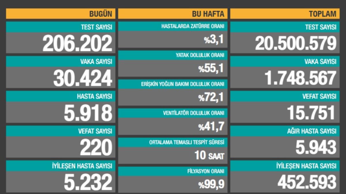 Ayrıca bugünkü tabloda salgın başından bu yana tespit edilen vaka sayısına da yer verildi. Buna göre bugüne kadar koronavirüs testi pozitif çıkan kişi sayısı 1 milyon 748 bin 567 oldu.