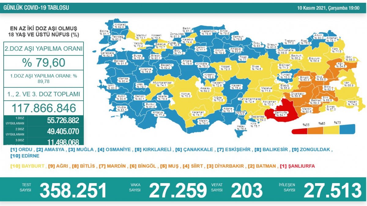 Buna göre; Türkiye'de son 24 saatte 358 bin 251 Kovid-19 testi yapıldı, 27 bin 259 kişinin testi pozitif çıkarken, 203 kişi ise hayatını kaybetti.