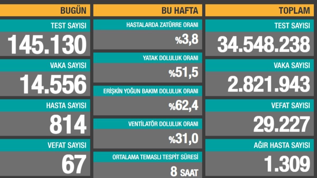 Bugünkü tabloya göre, son 24 saat içerisinde 145 bin 130 kişiye koronavirüs testi yapıldı. Böylelikle yapılan toplam test sayısı 34 milyon 548 bin 238'e ulaştı.