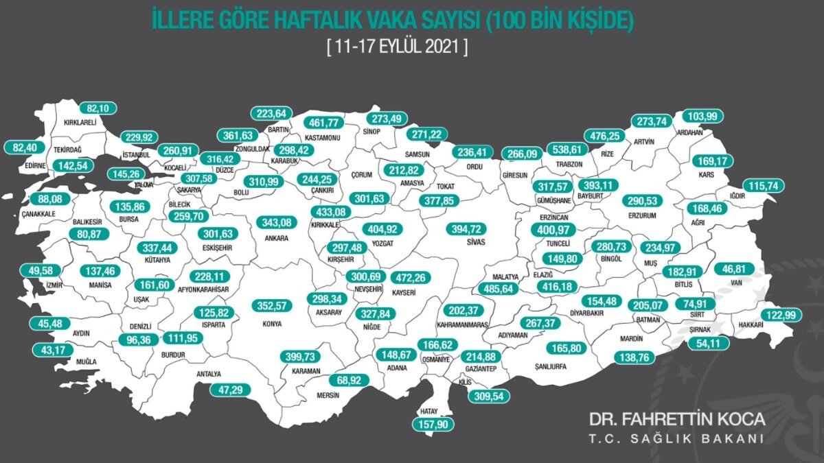 Fahrettin Koca haritayı, "11-17 Eylül arasında, 100.000 kişi içinde bir haftalık toplam yeni Covid-19 vaka sayısı neydi? Yaşadığınız, gidip geldiğiniz ildeki durumu haftalık İnsidans haritamızdan öğrenebilirsiniz." notuyla paylaştı.