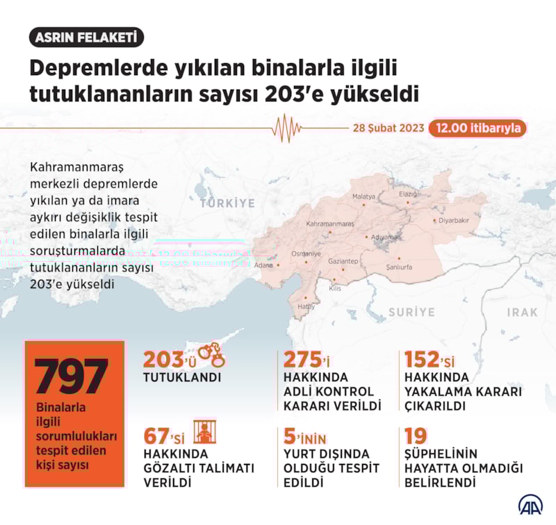 Son olarak yıkılan ya da imara aykırı değişiklik tespit edilen binalarla Cumhuriyet başsavcılıklarınca başlatılan ilgili soruşturmalarda tutuklu sayısı 203'e yükseldi.