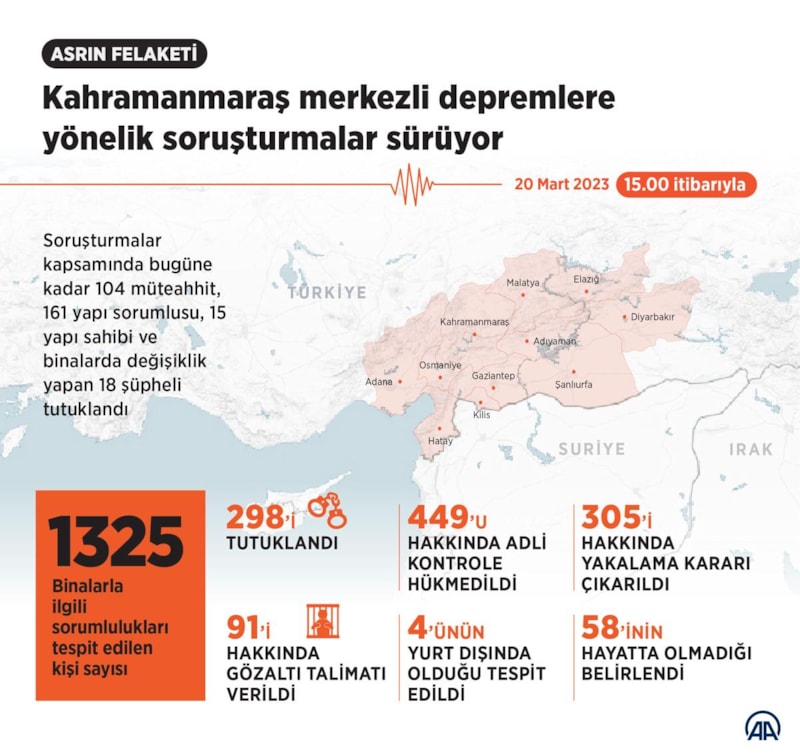 86'sı müteahhit, 280'i yapı sorumlusu, 52'si yapı sahibi ve 31'i binada değişiklik yapan olmak üzere 449 zanlı hakkında da adli kontrole hükmedildi.