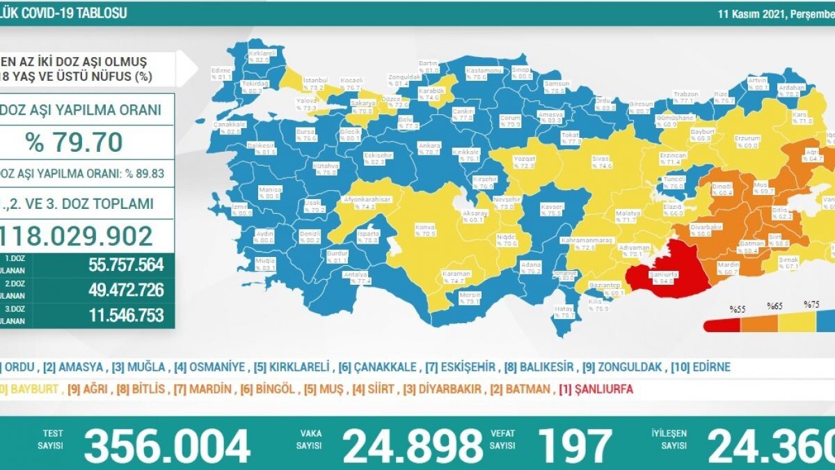 Buna göre; Türkiye'de son 24 saatte 356 bin 4 Kovid-19 testi yapıldı, 24 bin 898 kişinin testi pozitif çıkarken, 197 kişi ise hayatını kaybetti.