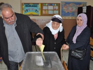 Oğlu ve gelinin kolunda kullanacağı 1012 nolu sandığa gelen Uskar, görevlilerin yönlendirmesiyle kabine girdi ve tercihini yaptı.